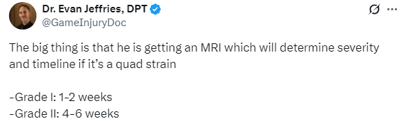 对于克莱伯的伤势,医学专家Evan Jeffries表示,最重要的是,他要接受核磁共振检查,以确定四头肌拉伤的严重程度和康复时间,1级拉伤休养1-2周,2级拉伤休养4-6周。